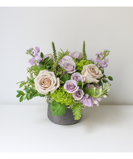 Betty is a gorgeous collection of lavenders and chartreuse in a black cement pot including mojito hydrangea, menta roses, lavender spray roses, lavender stock and lysmachia. Perfect for any event or to brighten a space in your home!