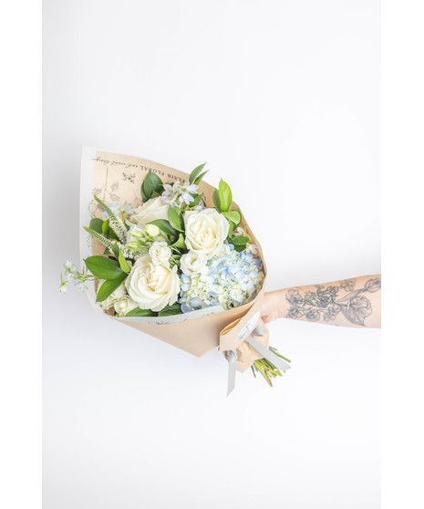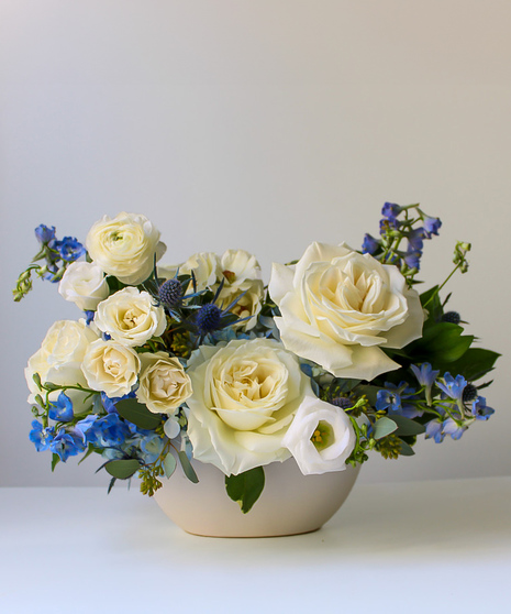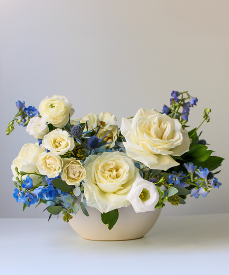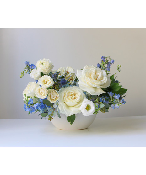 Classic whites and blues, this design features white roses and spray roses nestled between blue hydrangea, white stock, snapdragon, and lisianthus. Finished with seasonal green foliage in a white ceramic vessel