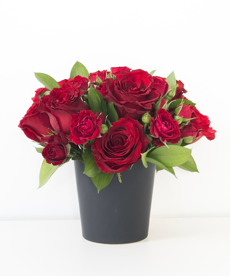 Indulge in timeless elegance with this premium red rose arrangement, featuring lush, velvety blooms complemented by fresh greenery. Artfully arranged in a sleek black tapered ceramic vase, this design exudes sophistication and charm. Perfect for romantic gestures, special occasion, or as a luxurious decor statement!