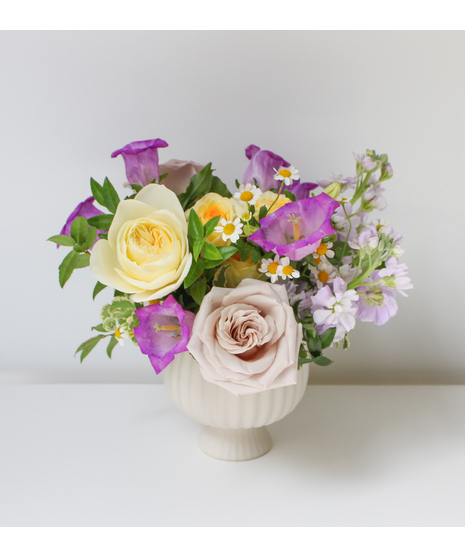 Dear John is a soft, romantic arrangement that feels like spring in full bloom. Creamy garden roses, airy chamomile, delicate stock and whimsical campanula fill an ivory ceramic compote. Perfect for brighteing a space or sending a thoughtful, uplifting gesture.
