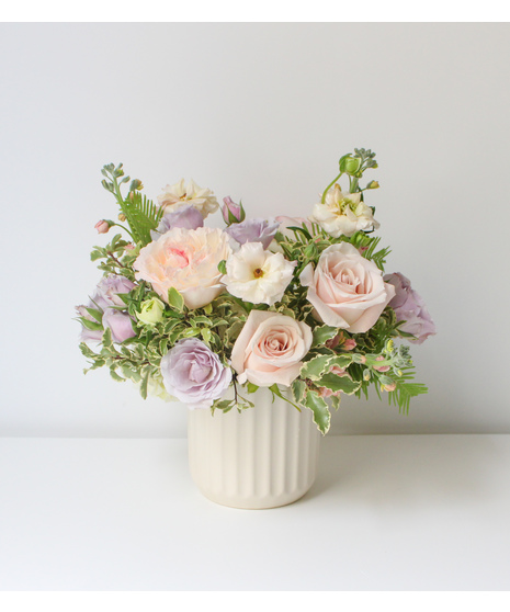 Our Este arrangement is soft and romantic in delicate spring tones, this bouquet features blush garden roses, airy butterfly ranunculus, and lavender spray roses accented with fresh seasonal blooms and textured greenery. Designed in a modern ribbed ceremic vase, the palete of peace, pinks, and pale lilac creates an elegant, garden-inspired look that feels both fresh and timeless. Perfect for celebrating a birthday, sending love, or simply brightening somone's day with a touch of graceful beauty.