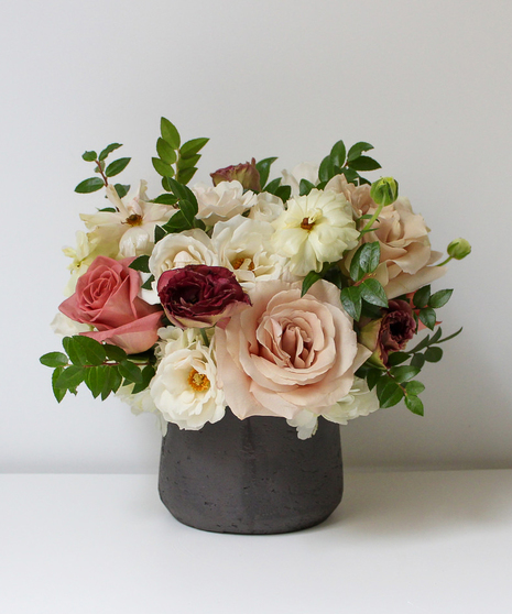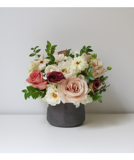 Fortnight is a timeless blend of elegance and warmth. This arrangement features soft blush quicksand roses, moody barista roses and cream white majolica spray roses & butterfly ranunculus. Accented by rich, wine toned lisianthus and lush greenery. Designed in a cement Patt S pot, it's the perfect choice for adding understated beauty to any space or occasion.