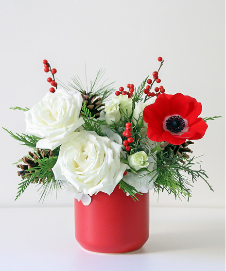 This winter floral arrangement is a delightful and festive display that captures the beauty of the season. The combination of velvety red anemones, pristine white roses, textured pinecones, and seasonal berries creates a harmonious and visually appealing composition. Overall, this winter floral arrangement finished in a red ceramic pot is a celebration of seasonal colors and textures, capturing the magic of winter with its festive charm and natural beauty.
