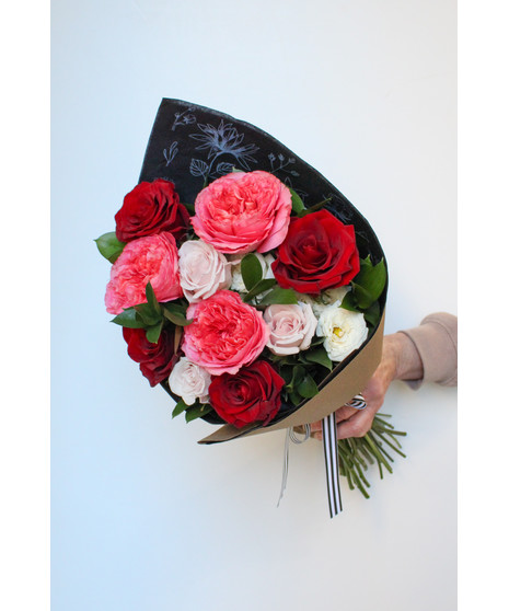 The Last Kiss Flower Bouquet is full of velvet red roses, hot pink Candy Expression roses, blush and white roses - a perfect combination for a Valentine's Day classic! Wrapped in our signiture tissue paper, kraft paper and black & white stripped ribbon.
