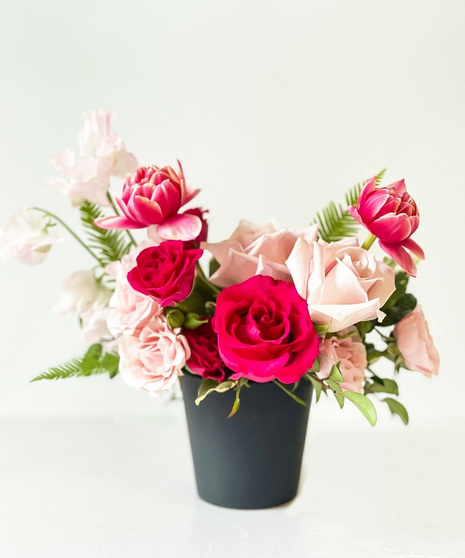 This piece features hot pink and soft blush roses, spray roses, and airy sweet peas framed by double tulips Finished with seasonal foliage in a sleek black pot.