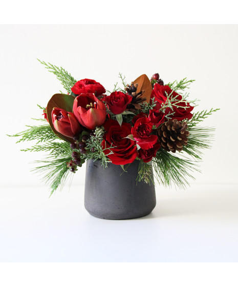 This harmonious blend of red roses, amaryllis, ranunculus, magnolia leaves, and pinecones, showcases a perfect balance of romance, drama, and natural elements. Finished in a black cement pot, it becomes a captivating focal point for any occasion.