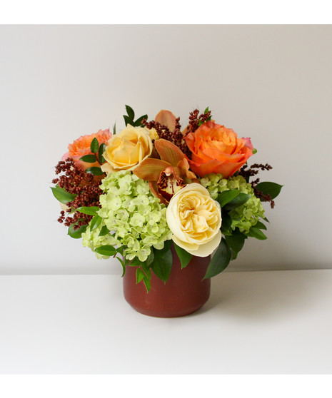 Ronan is vibrant and full of texture - this arrangement features green hydrangea, Effie garden rose, Free Spirit roses, brown orchids and broom corn. Arrtfully designed in our brown ceremic Kendall vase. A warm and sophisticated palette perfect for fall gatherings or any occasion that calls for a touch of seasonal charm.