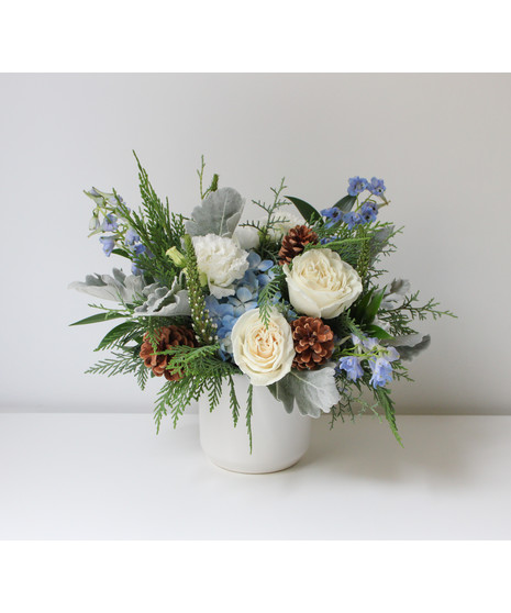 The beautiful presentation of pale blue and creamy white blooms embodies the beauty of the coastal winter snow. Crisp white roses are tucked between pale blue hydrangea and pristine white lisianthus. Adorned with pinecones and lush evergreens in a matte white vase.