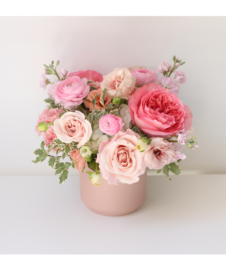 Our Sophia arrangment is the perfect blend of sweet and spring put together. Designed in a light pink ceremic pot, the arrangement boasts white hydrangea, pink roses, pink spray roses, stock and ranunculus. Perfect to celebrate warm weather, a new baby girl, a birthday or just because!