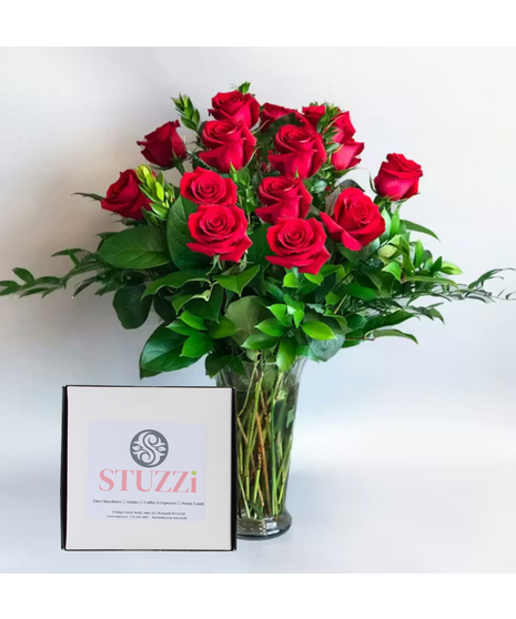 A timeless classic bouquet of twelve long-stemmed roses with rich mixed greenery expertly arranged in an elegant glass vase.