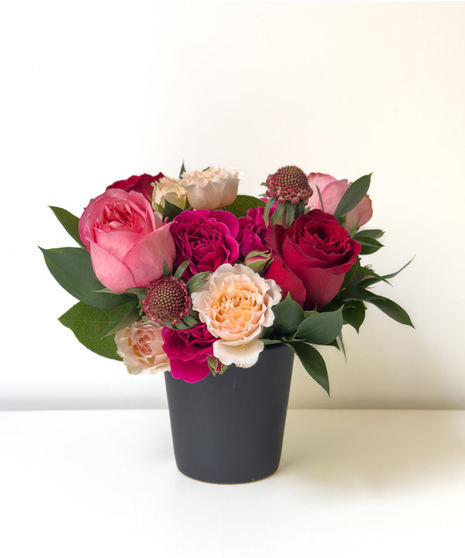 A beautiful flower arrangement with bright red, soft pink, and creamy peach roses, paired with delicate lisianthus and fresh greenery. It comes in a stylish black pot with a modern shape, making it perfect for any occasion.
